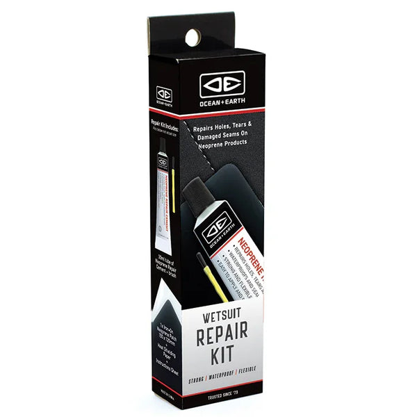 Ocean & Earth's wetsuit repair kit comes with neoprene repair cement and applicator, iron-on neoprene patch and heat shielding paper. Perfect for repairing small holes and tears.