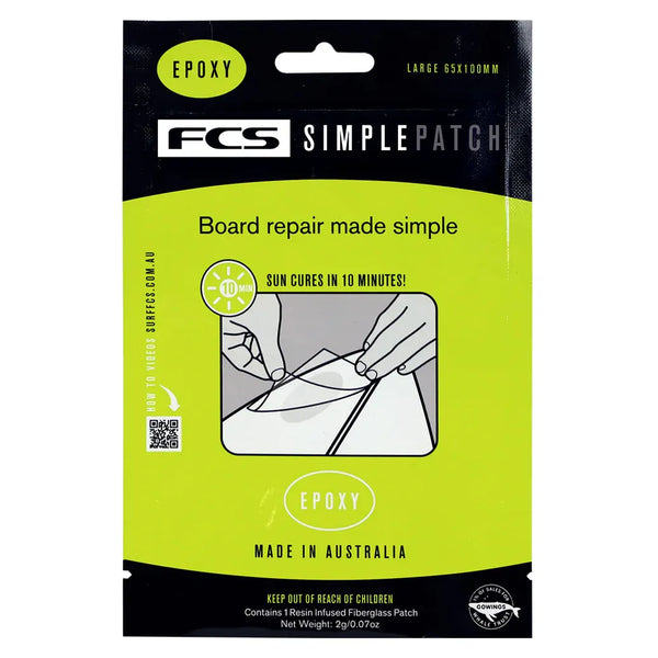 FCS SimplePatch is a revolutionary peel and stick resin-infused 3oz fibreglass patch that can be easily applied to create a smooth, waterproof, high-strength permanent repair in minutes. No need to mix resins, no more sticky fingers, and no more endless sanding.