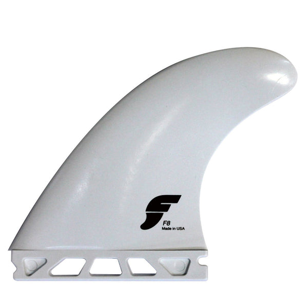 The F8 is the largest fin in the F-series. Combining medium flex characteristics with a balanced template to create one of the most versatile fins for large surfers. The F8 provides the perfect amount of drive and hold when on rail. The White Composite (Thermotech) construction gives the fin a consistent flex that holds great on the bottom, and then releases through turns