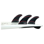 The Techflex construction with the flat foil give this fin a stable feel, providing the speed control needed in powerful waves. This setup features a smaller center fin for increased maneuverability.