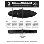 A heavy-duty triple shortboard boardbag designed for serious travelling. Comes equipped with 10 mm padding and additional protection on the nose and tail.