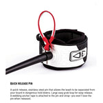 A quick release, stainless steel pin allows the leash to be separated from your board in dangerous hold downs. Large easy grab loop for easy release. A webbing anchor tape is attached to the pin and strap. You won’t lose the pin when released.