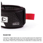 Loop type or ridged release tabs can cause the ankle strap to be ripped from your leg. The lightweight webbing tab on the O&E Big Wave leash eliminates this problem. There is also a second tab on inside velcro to release after use.