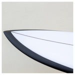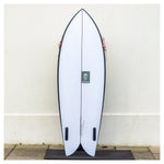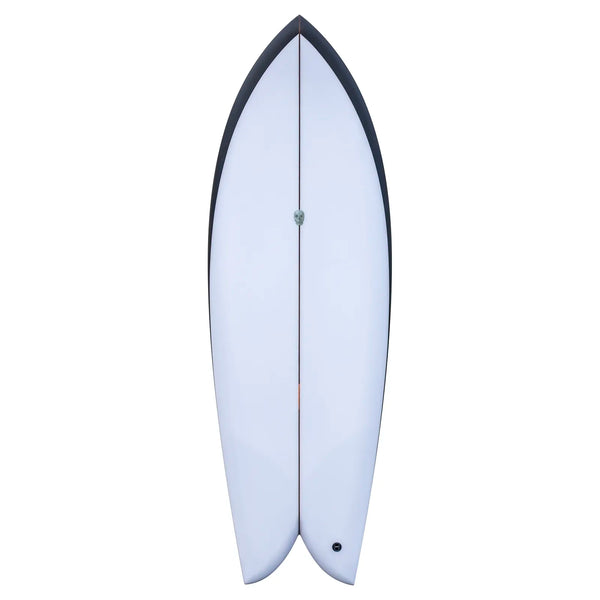 There's the regular wider fish outline, with the bulk of the foam forward on the board making it a great paddler. Low, sharp rails provide added bite and rail sensitivity. The tail is what Chris calls a "twin pin", as it is effectively just that. A double pintail that in effect creates 2 pivot points, creating hold in steeper waves and really allowing you to push off them through turns without spinning out. (All too common on many wide tail fish boards). A deep single concave runs between the fins and right through to the tail, channelling water in between the fins for extra speed and drive.