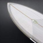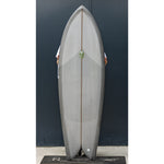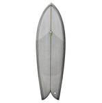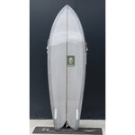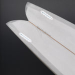 There's the regular wider fish outline, with the bulk of the foam forward on the board making it a great paddler. Low, sharp rails provide added bite and rail sensitivity. The tail is what Chris calls a "twin pin", as it is effectively just that. A double pintail that in effect creates 2 pivot points, creating hold in steeper waves and really allowing you to push off them through turns without spinning out. (All too common on many wide tail fish boards). A deep single concave runs between the fins and right through to the tail, channeling water in between the fins for extra speed and drive.